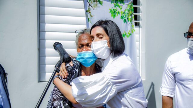 La primera dama, Raquel Arbaje, asistió hoy a la entrega de una vivienda a los familiares de Claritza Nivar y Darwin Frías, madre e hijo, quienes fallecieron en el sector Las Palmeras del kilómetro 14 de la Autopista Duarte, tras el derrumbe de una pared ante los efectos de la tormenta Laura, que azotó al país en agosto pasado.